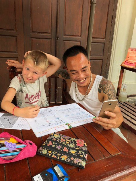 On rentre en Grab (l équivalent du huber en France). Marin est un peu malade et vomi dans la voiture ou plutôt dans mes mains. On descend rapidement et on rentre à l hôtel. Mais où est mon téléphone ? Oh non dans le taxi 😨. On est mal, on a aucun contact la réservation du grab a été faite avec mon téléphone. L hôtesse de l hôtel appel plusieurs fois mais il est en silencieux ….Antho retourne à l endroit où il nous as déposé au cas où … Albane s occupe de son frère malade. Et puis une idée ( oui oui ça m arrive 😁)je prend la tablette et géolocalise mon téléphone, ouf ça marche je le vois se déplacer dans la ville, 👍 on le fait sonner mais rien. Je me voyais déjà en course poursuite dans les rues de Hanoï … Antho revenu, appel sans cesse et il fini pas décrocher 😅. Il nous ramène gentiment notre téléphone à l hôtel et repart avec un joli pourboire tellement nous étions contents 😀. On a eu chaud 🥵 MERCI la nouvelle technologie.