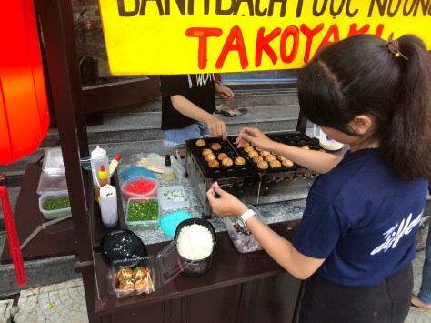 Vendeuse de beignets à Hanoi Grilled fish in banana leaf et Chicken cashewnut, et des soupes à l’ananas en accompagnement.