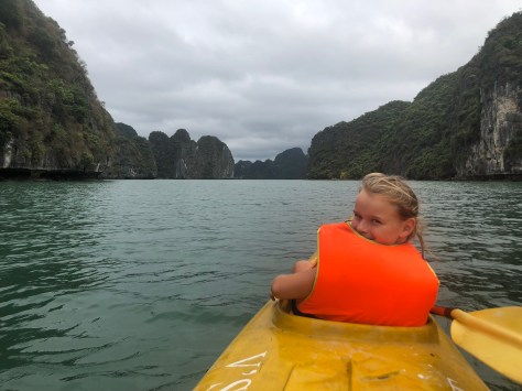 On navigue entre les villages flottants de pêcheurs, ces rochers plus ou moins grands. On fait plusieurs balades en kayak pour mieux approcher ces monstres sortis de l’eau ou encore passer dans des grottes.