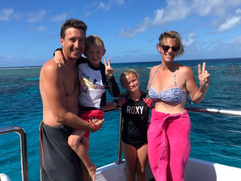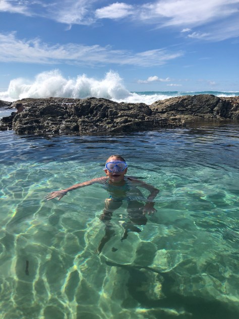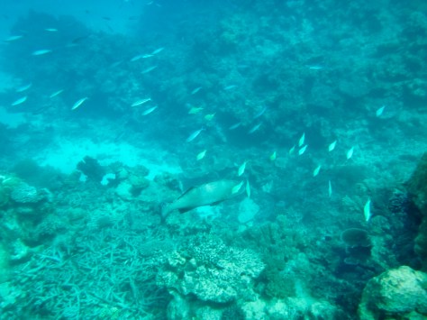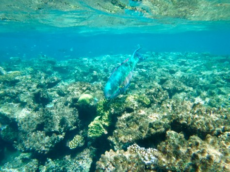 Snorkeling pour Albane : elle part avec un groupe encadré par un moniteur qui plonge en apnée et explique les différents poissons et coraux rencontrés (coup de chance il y a un français comme moniteur et c’est lui qui est avec Albane, elle a donc droit aux explications en privé. Et en plus elle voit aussi une raie, elle est plus que ravie.