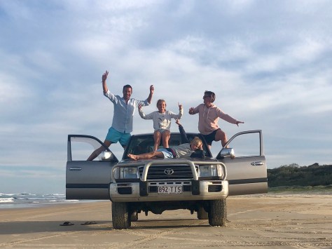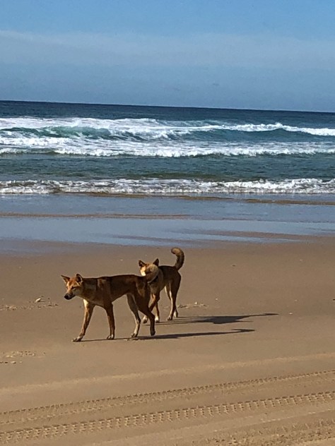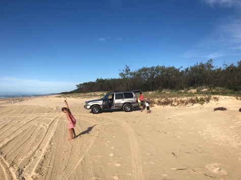 Deuxième mission, descendre de la barge et savoir où aller, on demande au gars de la barge et il nous dit à droite, lets go ! On patine dans le sable mais c’est parti, on roule sur la plage sur Fraser Island.😜