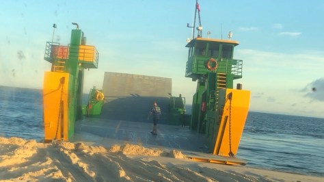 On arrive au bout d un bras de sable, rien ne nous signale que nous sommes au bon endroit et on est censé prendre une barge mais rien à l horizon 😰 et oui après quelques minutes on voit un bateau s avancer qui en s’avançant ressemblerait à une barge. Elle arrive vers nous, on est au bon endroit, ouf.