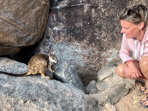 Lors d’une balade, nous arrivons sur une jetée avec de nombreux gros rochers dans lesquels ce cachent des wallabies des roches, on prends une pomme 🍎 pour leur donner. Les enfants sont trop heureux 😁, car les wallabies se laissent approcher et même nourrir à la main.