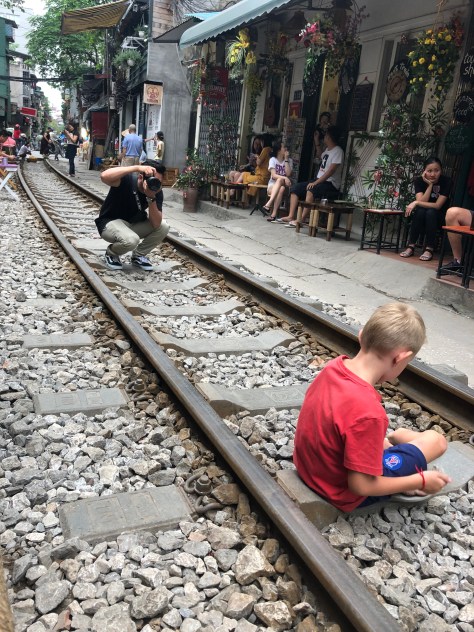 En se promenant dans hanoi on passe sur les rails dans des minuscules ruelles, apparement en voyant le panneau le prochain train passe dans 1 heure, le temps de s installer sur l une des mini terrasses et déguster un bon café. 1h30 plus tard, 3 cafés et 3 bières pour Antho on attend toujours …. tout compte fait il ne passera pas, le prochain est dans 2 heures …. on reviendra !